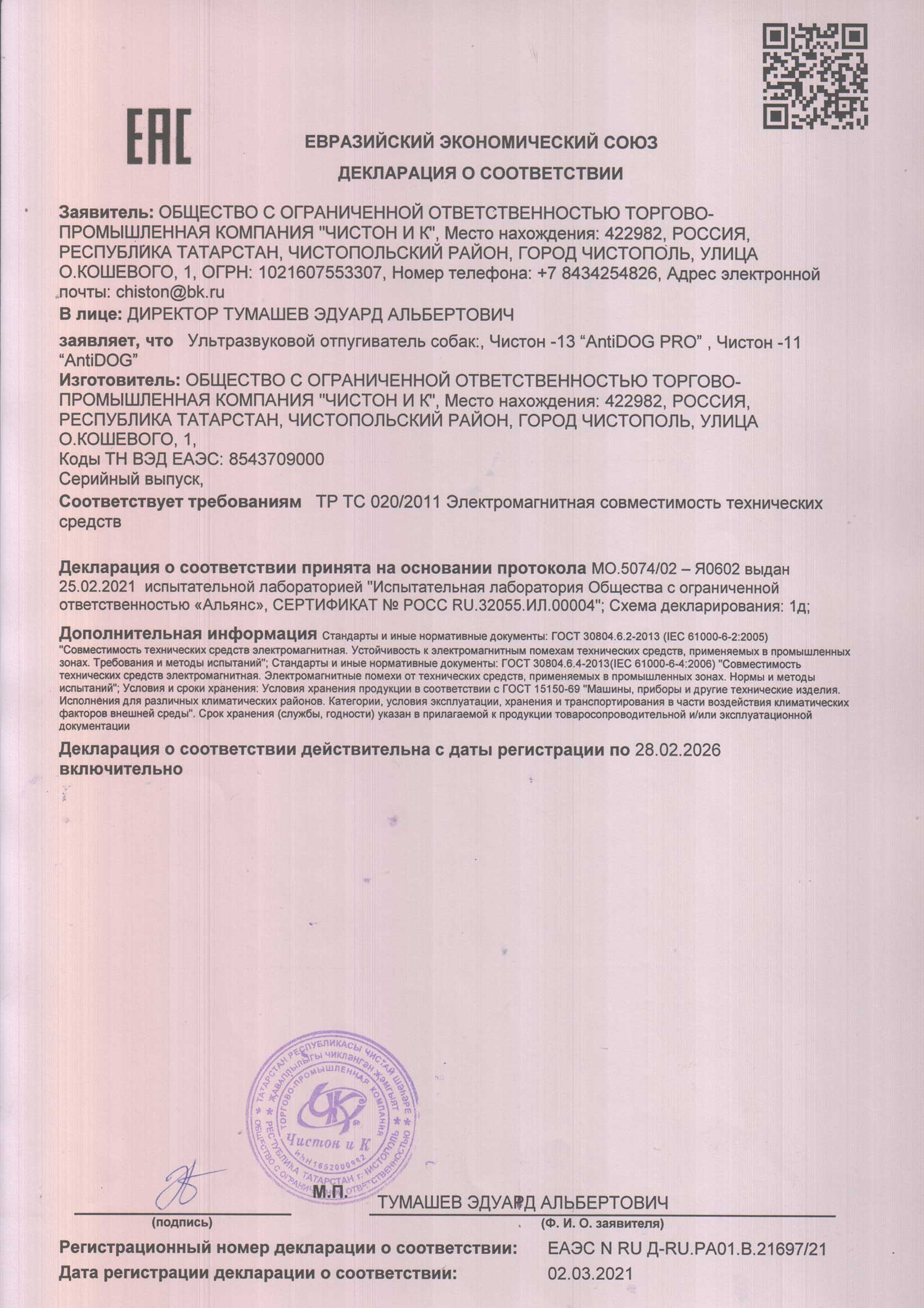 Данный прибор представляет собой один из самых мощнейших отпугивателей собак на российском рынке. Это более современная и продуманная модель, по сути дополненная версия всем известного прибора Чистон-11. Обновленная версия отличается формированием входных сигналов по специальному алгоритму, разработанному именно для данного устройства.