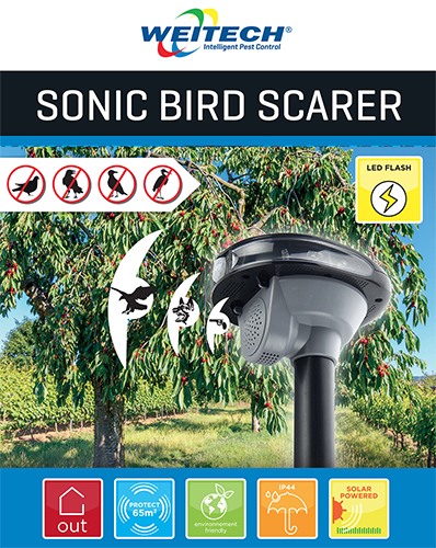 Функциональный звуковой отпугиватель "Weitech WK-0025" способен защитить ваш огород, сад, дачу, двор или любую др. территорию площадью 65 м2 от птиц (голубей, скворцов, ворон, воробьев, чаек и т.д) и животных (кошек, собак, зайцев и пр.). Работает полностью автономно благодаря встроенной солнечной панели.